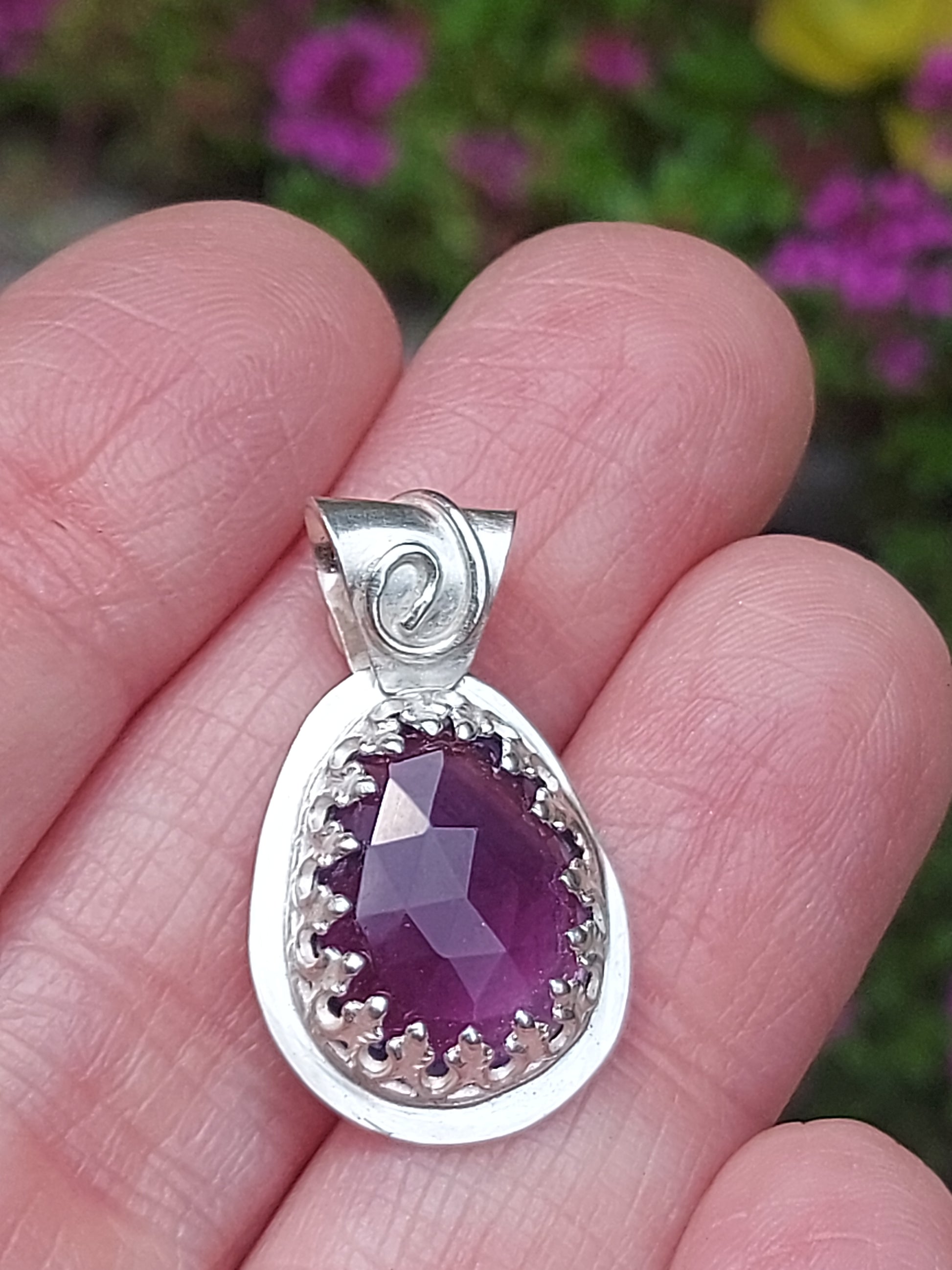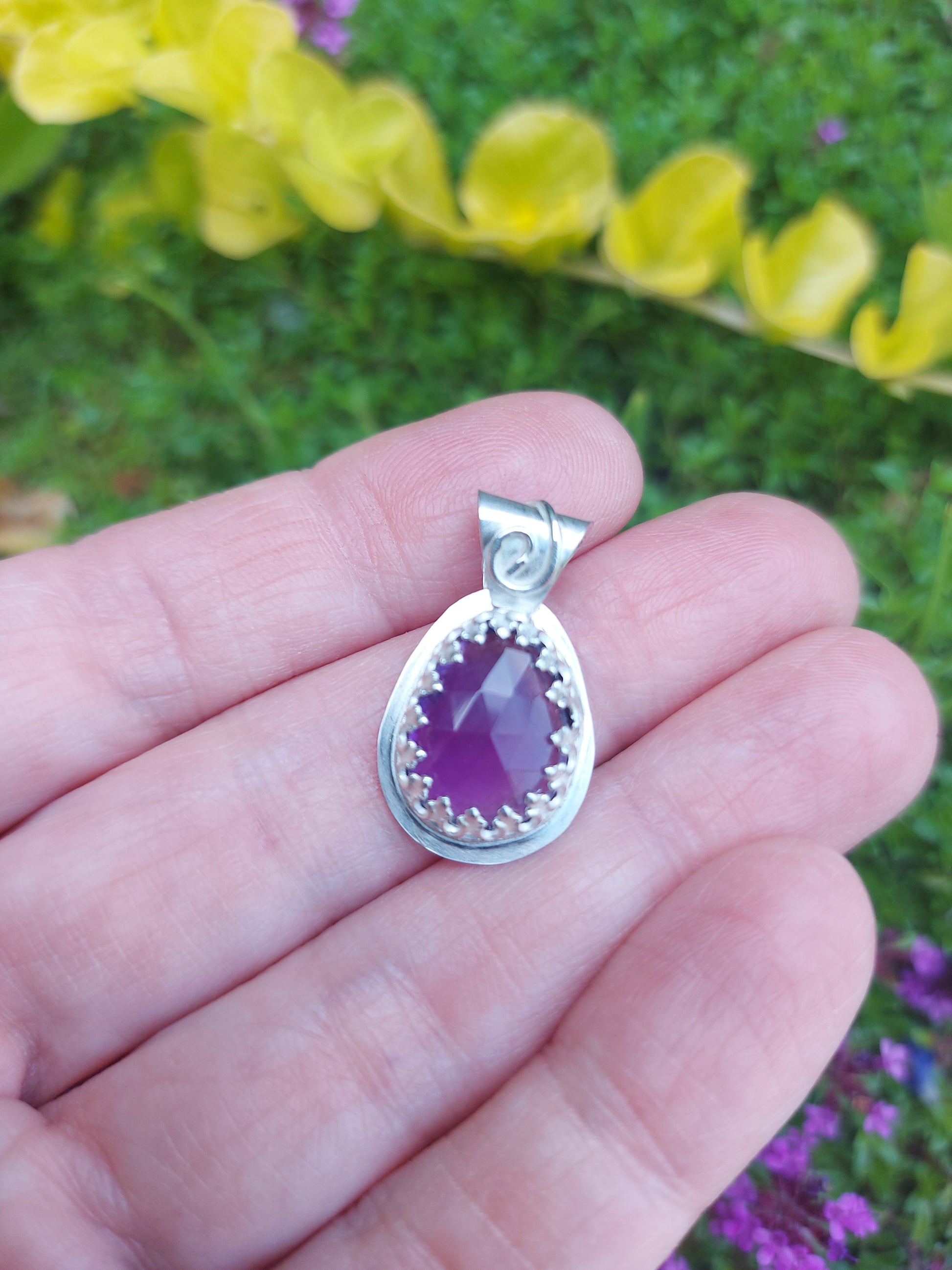 This delicate amethyst petal pendant is designed with a graceful scalloped edge and an open back that allows light to enhance the stone’s rich, deep purple hue.