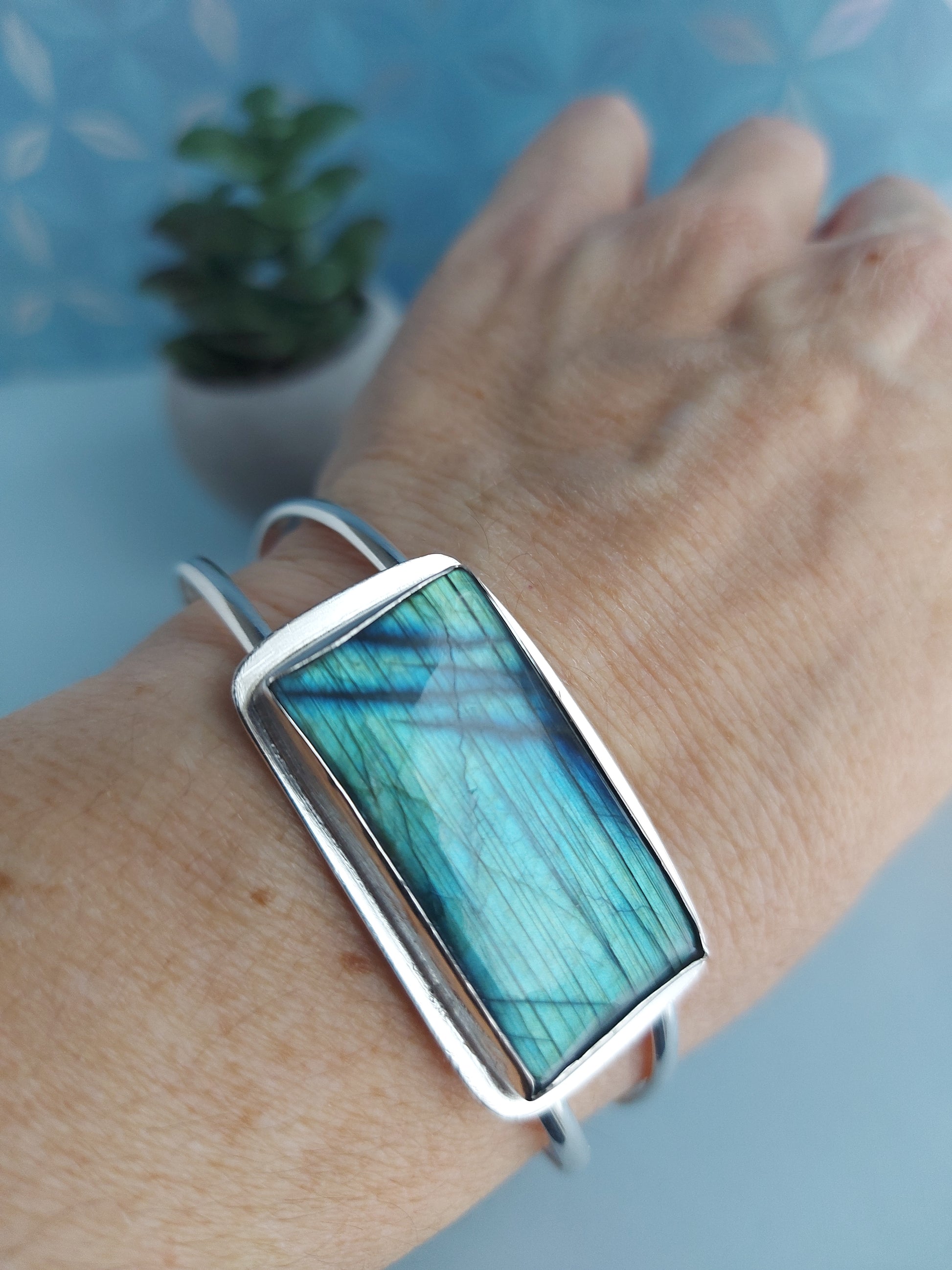 The Third Eye Chakra, located in the center of the forehead, is often associated with intuition, inner wisdom, and spiritual awareness. Labradorite, with its mystical properties, is believed to activate and balance this chakra, promoting psychic abilities, intuition, and spiritual connection. This luxurious Labradorite bracelet, handcrafted with heirloom-quality blue flashes reminiscent of the ocean, is a powerful tool for self-discovery, spiritual awakening, and protection against negative energies and misfortunes. Elevate your style with this elegant piece of jewelry.