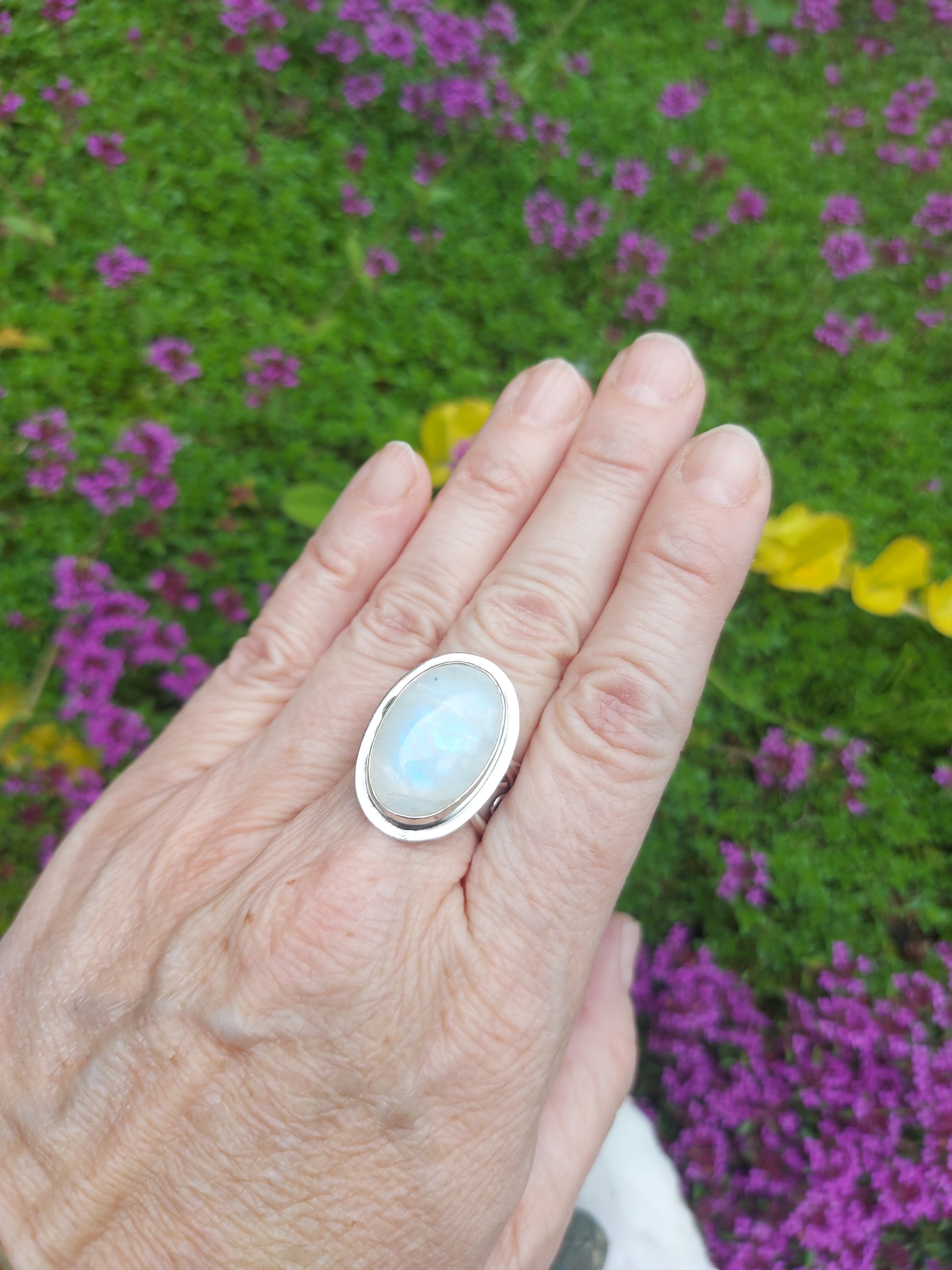 This exquisite piece symbolizes light, hope, new beginnings, and brings to life themes of fertility, balance, softness, and intuition. Emotionally, it brings calmness, reduces stress, and stabilizes emotions. Boost your intuition and success in love and business with Moonstone. Elevate your emotions with love and hope, and share your kindness and humanitarian qualities with the world. Add this stunning Moonstone ring to your moon altars and meditations to access your higher consciousness.